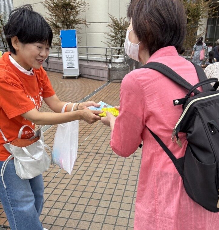 休日で歩行者が行きかう中、沢山の人にチラシを受け取っていただけました。