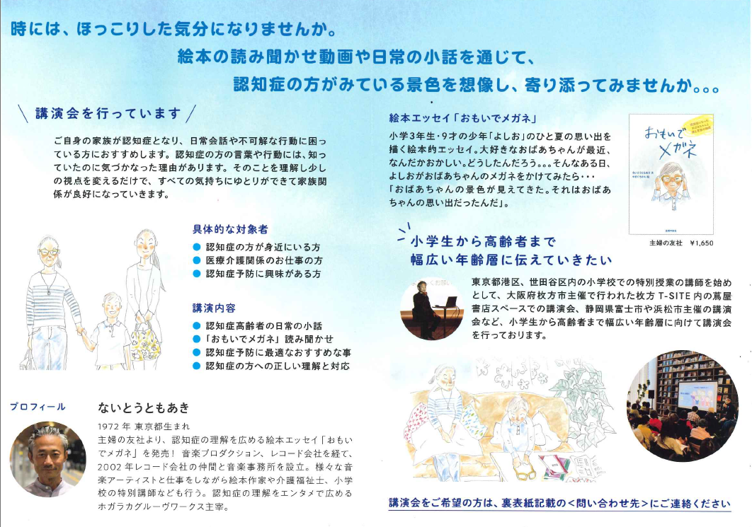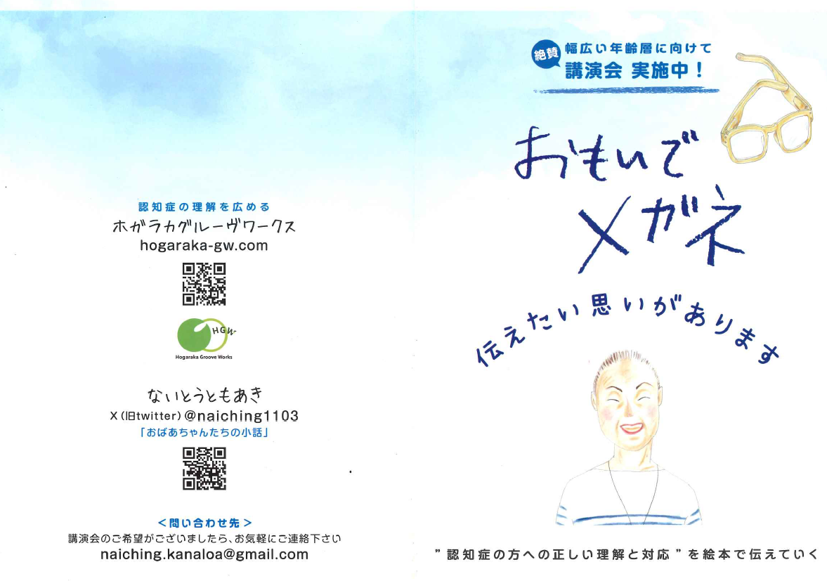 2025/11/19 お知らせ 11/17 「おもいでメガネ」の作者さんが来所されました! 絵本エッセイ「おもいでメガネ」を執筆された内藤智晶さんが来所されました。 内藤さんは、介護福祉士としてグループホームで働く中で得た体験から影響を受けて、この絵本の原形となる物語を書き始めたそうです。現在ではこの「おもいでメガネ」を活用し、認知症の理解を広める講演活動を全国各地で展開されています。 認知症の人に見えるのはどんな景色なのでしょう・・・小学生から年配の方まで、幅広い年齢層にお勧めの本です。是非、お手に取ってみてください♪ 前へ 記事一覧へ