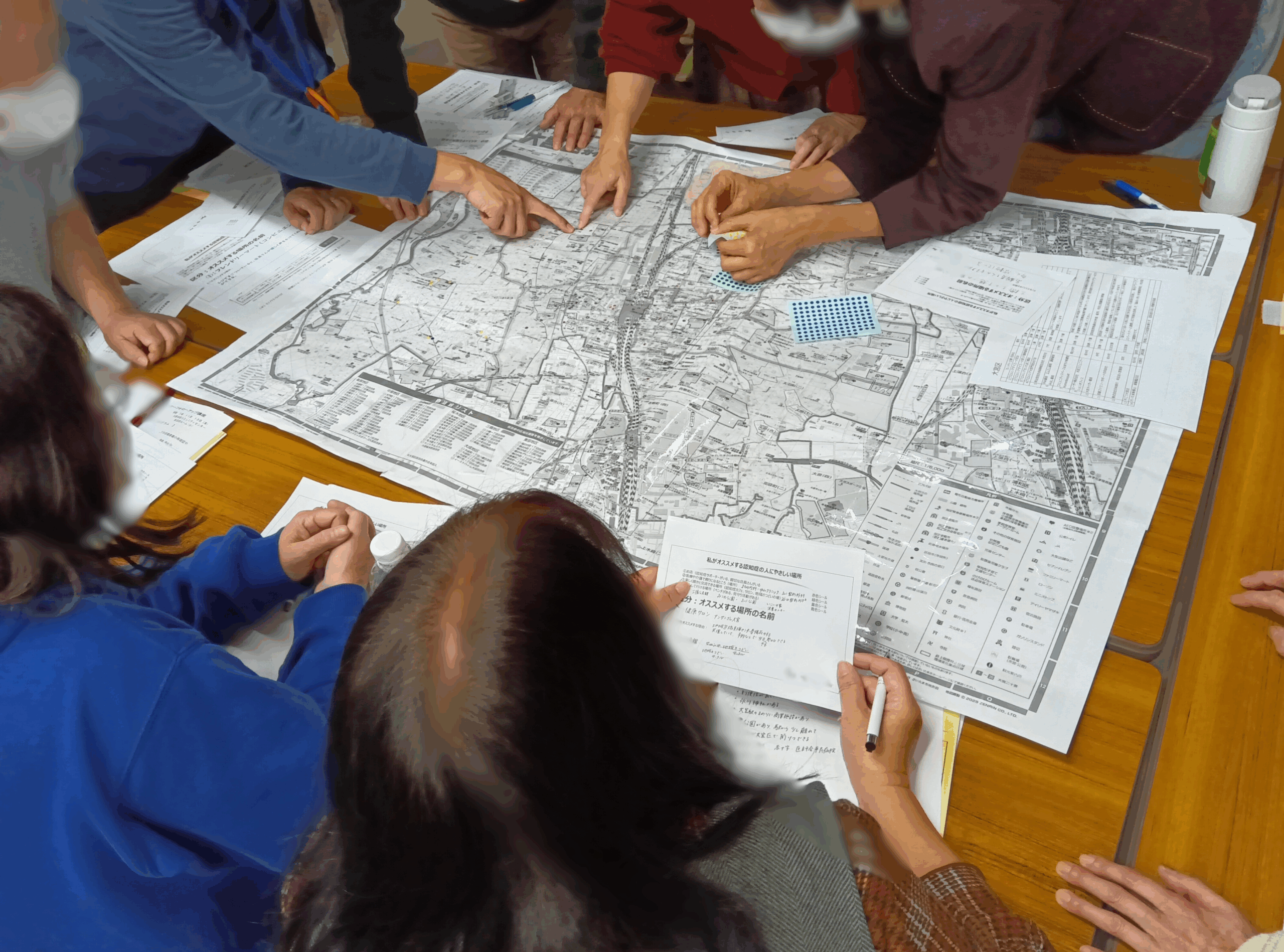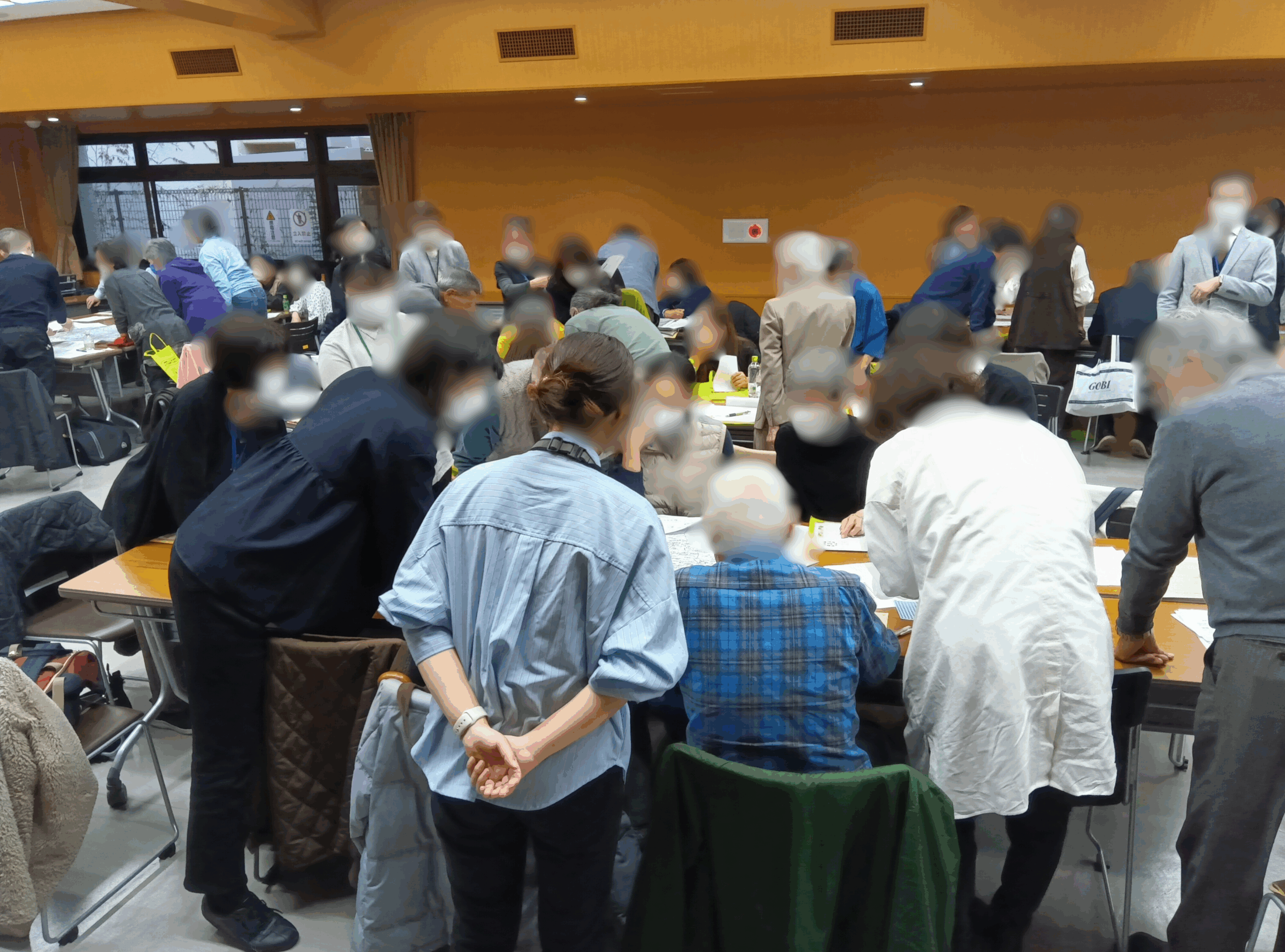グループワークでは、各区に分かれて「お助けマップ」を作るという試みをしました。アンケートには「安心できる、頼りになる場所がたくさんあることに気づいた」との声もあり、マップ作りを通じて自分たちの地域の魅力を再認識していただけたようです。提出されたアンケートには、「楽しい」という言葉が記されたものが複数ありました。に気づいた」との声もあり、マップ作りを通じて自分たちの地域の魅力を再認識していただけたようです。ご参加いただいた皆さま、ありがとうございました。これからも今日の出会いを大切にし、認知症の人とともに暮らしやすいまちづくりに「楽しく」取り組んで参りましょう!